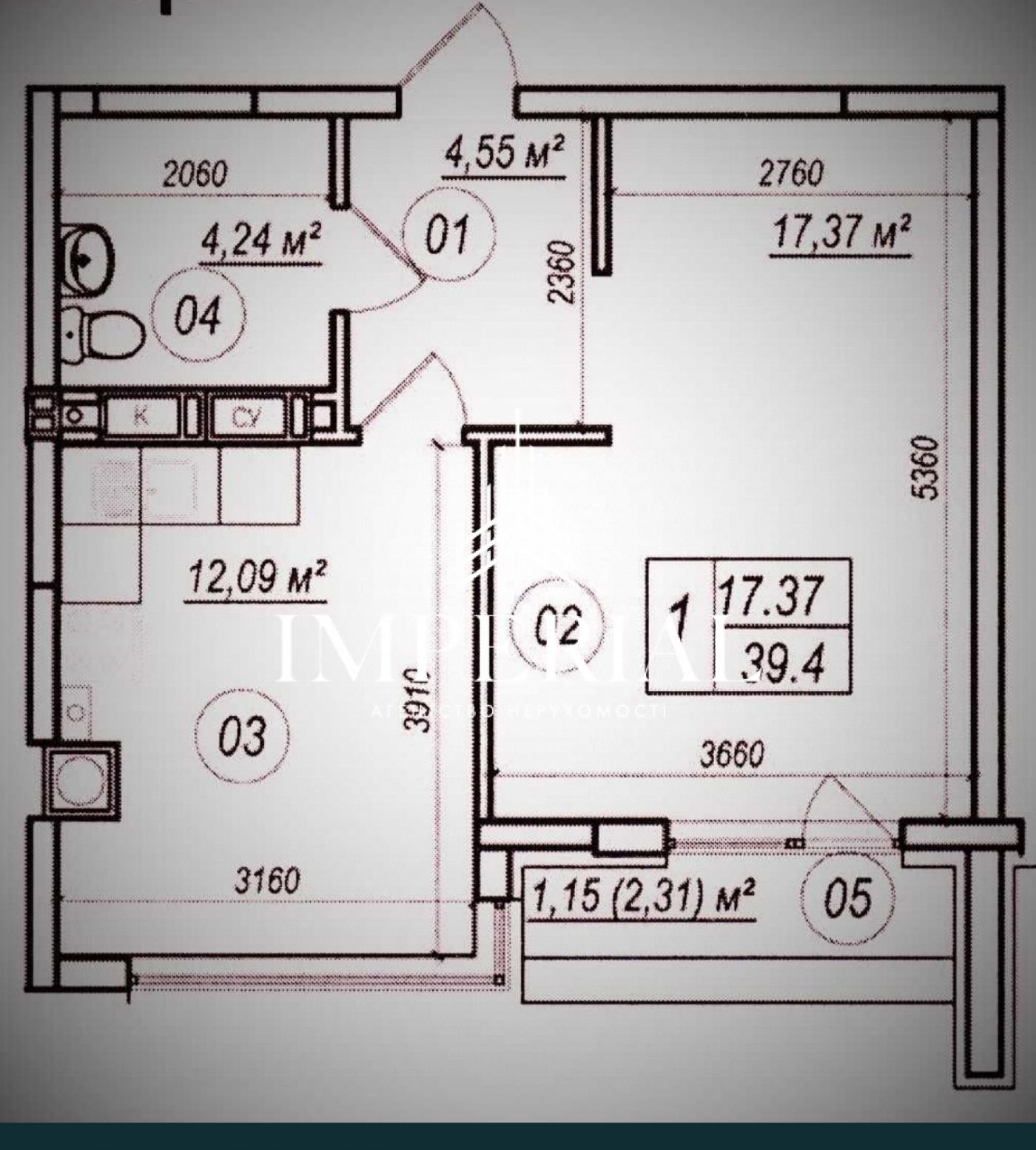 Площа: 40 м² (житлова 17 м², кухня 12 м²)