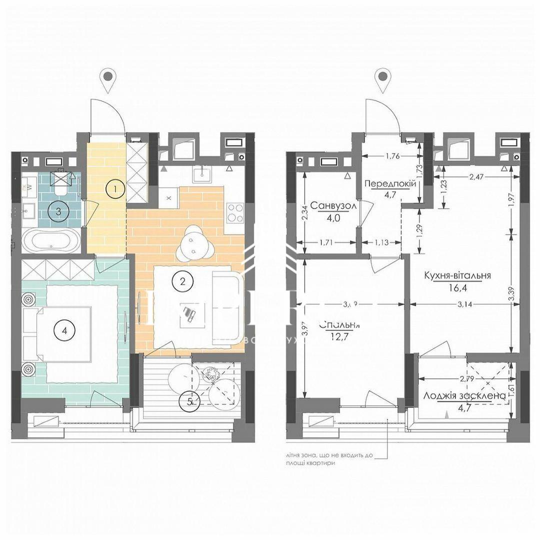 Площа: 43 м² (кухня-вітальня 16.5 м², спальня 12.5 м²)