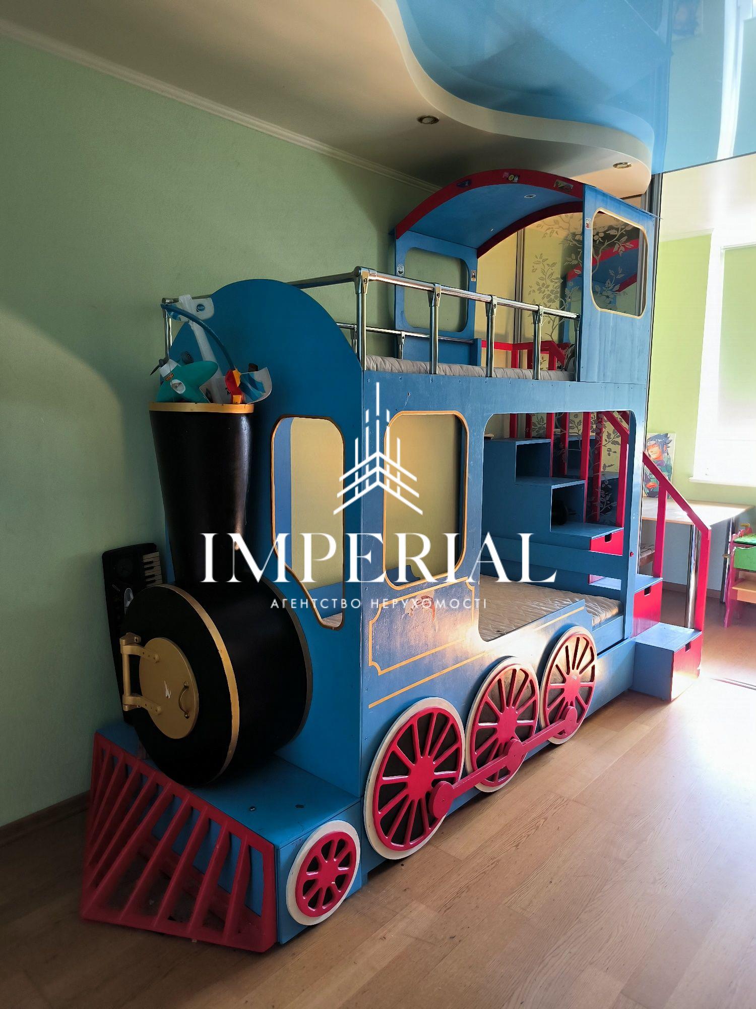Дитяча: двоярусне ліжко-потяг, шведська стінка, навчальні столи, книжкові полиці