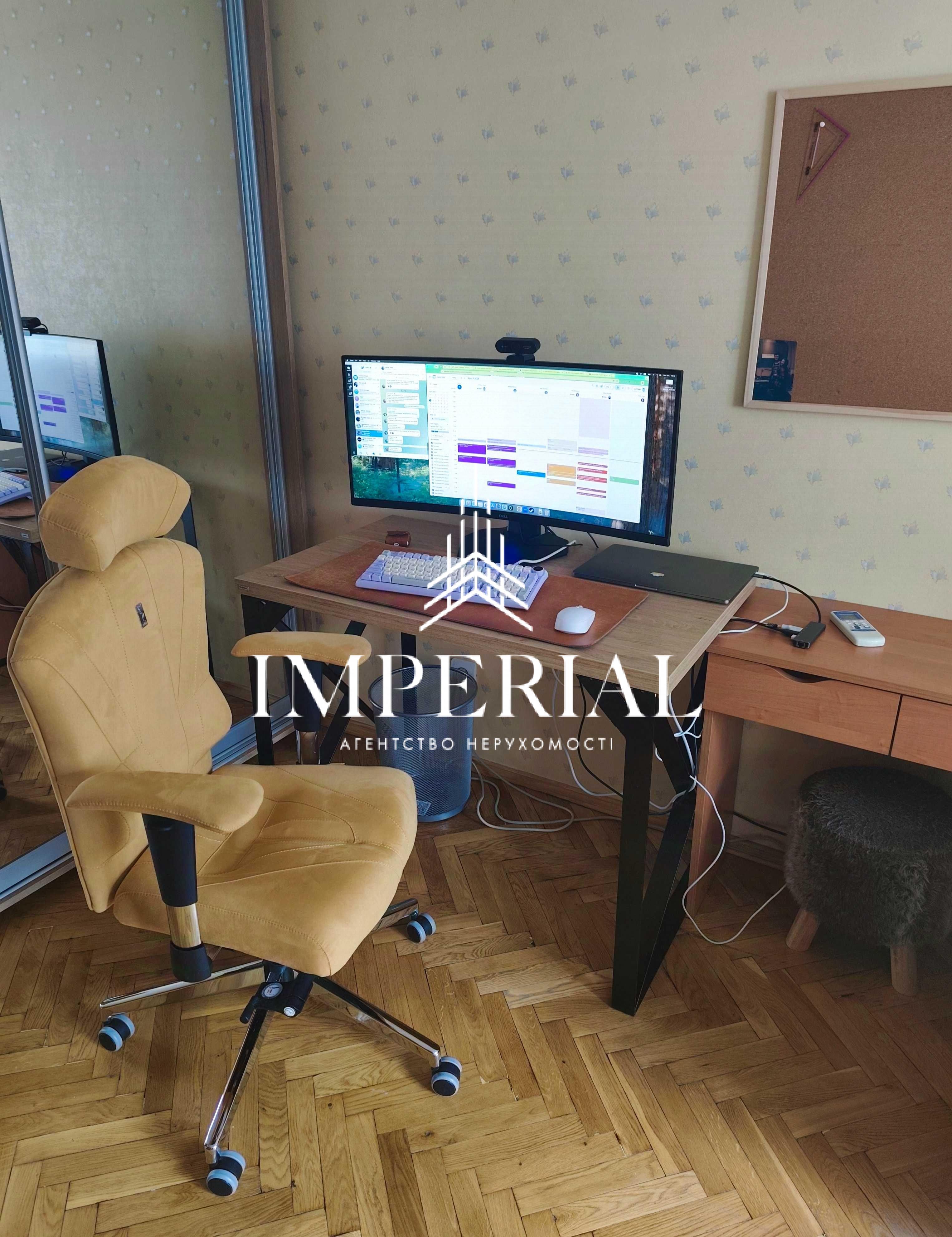 Кабінет/друга спальня: робоче місце, диван, телевізор, шафа-купе, вікна виходять на Велику Васильківську, Костел та ресторан "Ішак"